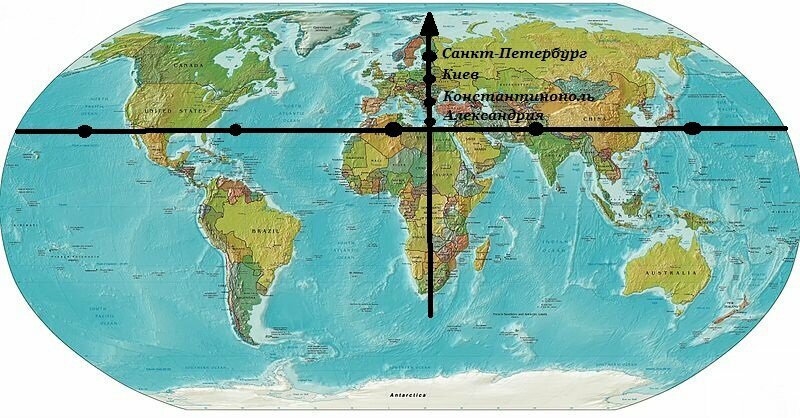 Ранее мы уже писали об открытии известного российского астронома Кирилла Павловича Бутусова о 30-м (Пулковском) меридиане, на котором расположены (с юга на север) Великие Пирамиды Гизы, Александрия (бывшая столица великой империи Александра Македонского), Константинополь (столица Византии), Киев (столица Древней Руси), и, наконец, Санкт-Петербург (столица Российской империи в 1717—1917 гг.) [6,7]. Так вот, К. П. Бутусов заметил, что Александрия, Константинополь, Киев и Санкт-Петербург возводились и становились столицами империй по мере движения некоего загадочного «Вектора Сфинкса» (или «Вектора Х») с юга на север со скоростью прецессии земной оси, то есть проходя 1 угловой градус (1 градус широты) за 72 года. Подробнее об этом смотрите в указанных выше статьях [6,7].