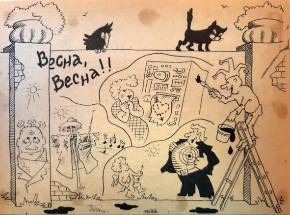 Итак, студенческая жизнь была прекрасна, полна приключений, как анти, так и про-общественных: например, сотрудничество в факультетской сатирической стенгазете «Шлак». Разумеется, творчество под шапкой «Рисунки на обложках тетрадей» никогда не прекращалось, в том числе и на военной кафедре – правда, сами рисунки все чаще являлись не просто абстрактными видениями, а либо изошутками, либо шаржами. Забегая вперед, замечу, что окончание института я ознаменовал публикацией дружеских шаржей на милейшего зав. кафедрой, профессора Михаила Максимовича Штейнберга, а также на других преподавателей. Это была первая ласточка моего карикатурного гнезда.