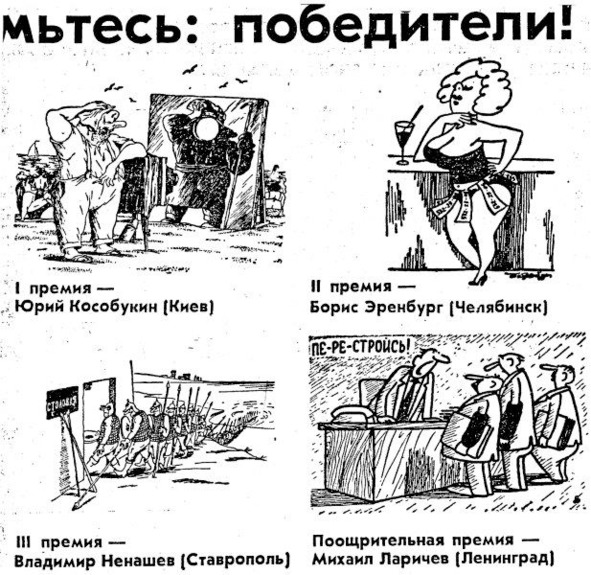 Кто мог тогда предположить, что увлечение карикатурой подарит мне такую массу впечатлений, счастья и ряд международных призов. Кто мог предсказать, что я опубликую тысячи карикатур и сатирических иллюстраций в газетах и журналах, в Союзе и по всему свету, выпущу свои авторскую книжку «Доля правды» и сборник в серии «Галерея Мастеров Карикатуры», что под аккомпанемент моих иллюстраций выйдут еще немало книг… Более того: спустя 10 лет после начала моей карикатурной карьеры я одним из первых карикатуристов «нового покроя» даже умудрился лично поехать за границу для получения серебряной медали международного конкурса на Кубе.