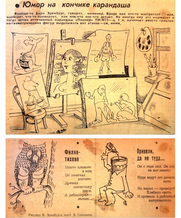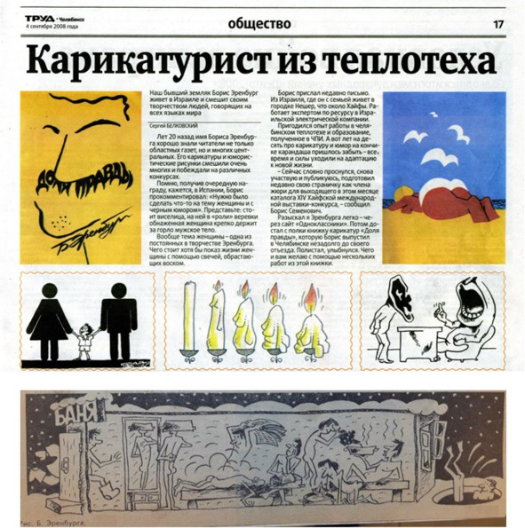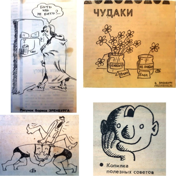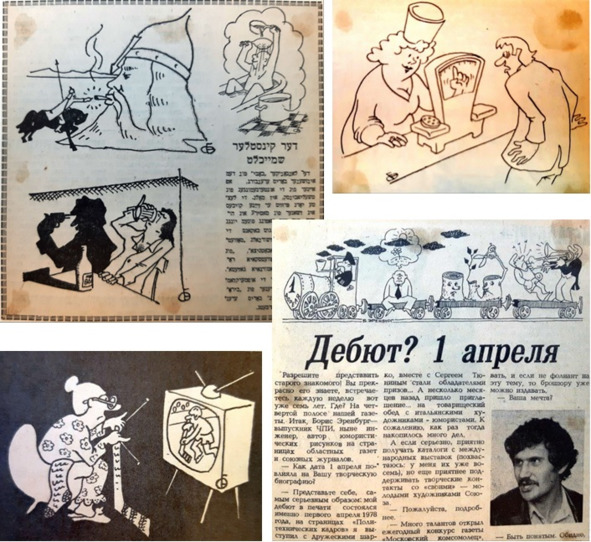 В прошлом году 40-летие своей карикатурной ипостаси я отметил персональной выставкой на Международном Фестивале в Сен-Жюст-ля-Мартель, во Франции. А 40 лет назад, в 1977 году, отец показал мои творения своему сотруднику, врачу-стоматологу Илье Герчикову, на сегодняшний день старейшему в мире литератору-юмористу (97!!!). Герчиков сотрудничал со многими изданиями как в Челябинской области, так и за ее пределами, но для начала он свел меня с многотиражкой Южно-Уральской Железной Дороги «Призыв». Именно мои первые публикации в «Призыве"в 1978 году дают мне лестное право считать Илью Лазаревича своим крестным отцом в области сатиры и юмора…