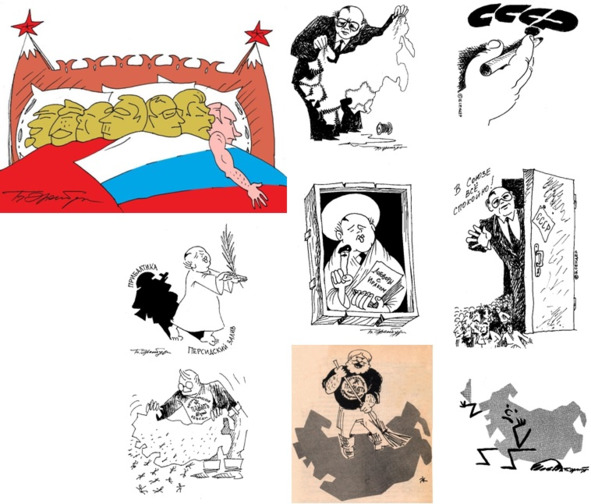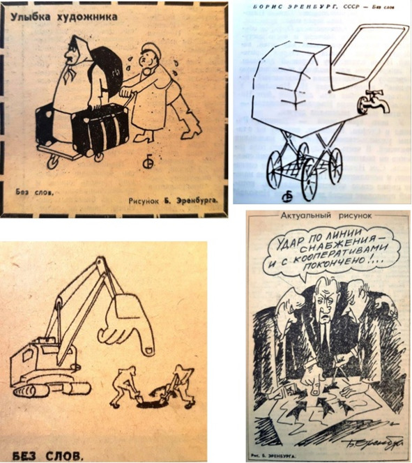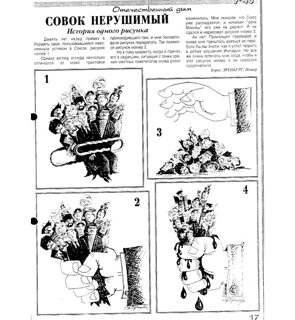 Так как по долгу службы я вел бурную командировочную жизнь: примерно неделю в месяц разъезжал по просторам Великой и Огромной, от Кишинева до Иркутска, от Перми до Фрунзе, география моих публикаций повторяла географию поездок, и мое материальное положение еще более от этого улучшалось. В общем мои рисунки в период 80—90 годах печатали 60—70 различных изданий.