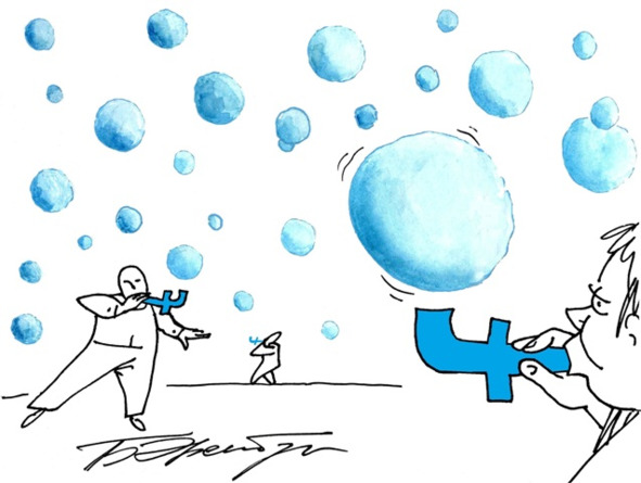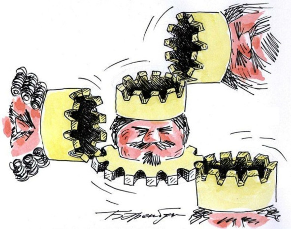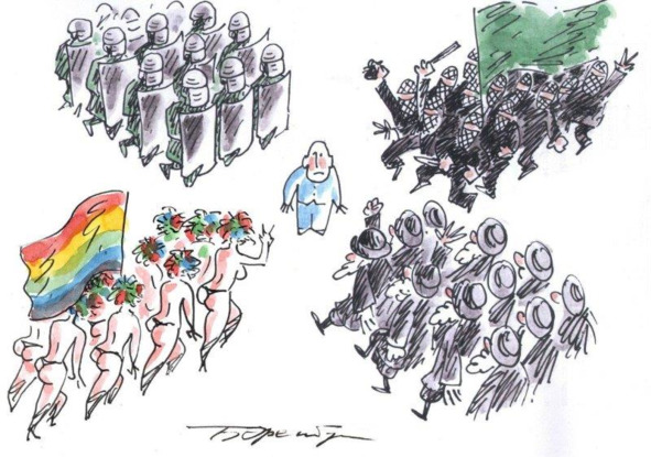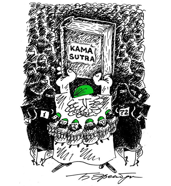 Я – за личные контакты между карикатуристами. Но контакт в моем понимании не означает и не оправдывает непременности цеховой солидарности и долговременной работы лишь над совместными проектами. Творческие союзы, как правило, не выдерживают дальних плаваний. Обычно же творчество не терпит стадности. Как только совместная деятельность вступает в конфликт с личными интересами, союз распадается. Впрочем, есть и редкие примеры обратного: например, когда стадность превращается в бренд, приносящий очень уж хорошие дивиденды, такие, как у Кукрыниксов. Или питерская группа «Нюанс» – чудесное образование, которое держится на мощи таланта, разума и такта Виктора Богорада и на неуемном энтузиазме и энергии Сергея Самоненко, коллекционера и издателя, паровоза и парохода – одним словом, Эфенди…