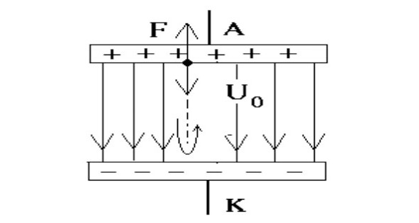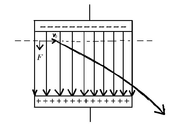 F kuch bo’lmaganda elektron to’g’ri chiziqli tekis v0 tezlik bilan xarakat qilar edi. F kuch ta’sirida elektron v0 tezlikka perpendikulyar bo’lgan yo’nalishda xarakat qilsin. Bunda elektronning traektoriyasi parabola ko’rinishida bo’lib, musbat potentsial tomon og’adi. Elektron maydondan chiqqandan so’ng xam inersiya bo’yicha to’g’ri chiziq bo’ylab tekis xarakat qiladi.