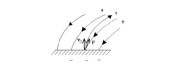 Agar elektron v0 boshlang’ich tezlik bilan maydon kuch chiziqlariga nisbatan to’g’ri burchak ostida xarakatlansa, maydon elektronga F kuch bilan yuqori potentsial yo’nalish bo’yicha taxsir etadi. (1.3-rasm)