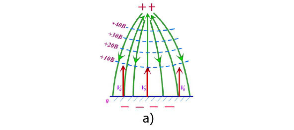 Ikki elektrod anod va katod orasidagi elektr maydon kuch chiziqlarini (kuchlanganlik chiziqlari) 1.1-rasmda ko’rsatilganidek tasvirlaylik.