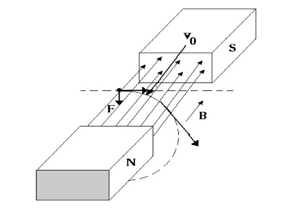 v0 boshlangich tezlikka ega bo’lgan elektron bir jinsli magnit maydonida kuch chiziqlariga tik ravishda xarakat qilsa, unga Lorents kuchi ta’sir qiladi.