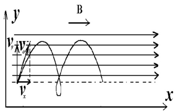 Magnit maydoniga ixtiyoriy burchak ostida kirayotgan elektronning xarakatini ko’raylik. Elektronnig boshlang’ich tezlik vektori va X o’qi bilan V vektor mos kelgan koordinata yuzasini tanlab olaylik. V0 ni ikkita, ya’ni VX va Vu tashkil etuvchilarga ajrataylik. VX xaraktalanuvchi elektronning yo’nalishi magnit kuch chiziqlari yo’nalishi bilan bir xil bo’lganligi uchun unga magnit maydon ta’sir qilmaydi. Agar elektron faqat shu tezlikka ega bo’lganda, u to’g’ri chiziqli tekis xarakat qilar edi.