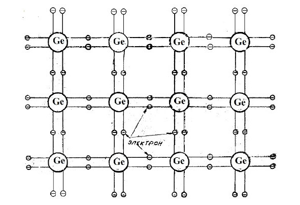 2.1-rasmda atomlarining tashqi orbitasida to’rttadan elektroni bo’lgan toza germaniyning yassi ekvivalent panjarasi keltirilgan. Elektron turg’un xolatda bo’lishi uchun, qo’shni to’rtta atom bilan kovalent ya’ni qo’sh bog’lanadi xamda valent elektronlar bu bog’lanishda ishtirok etadi.
