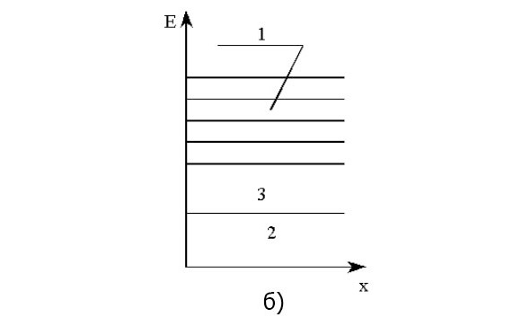 2.2-rasm. Energetik zonalarniki, a-oqekazgihlarniki; b-yarim-oqekazgihlarniki; c – dielektriklarniki: 1 – oqekazuvchanlik zonasi; 2 – valent zona; 3 – jamoa zonasi.