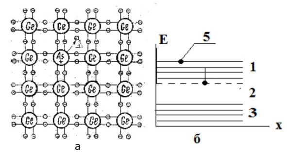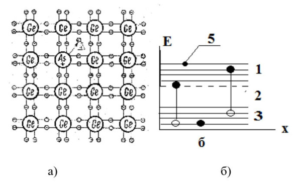 2.4 -rasm. Mishyak aralashgan germaniyning ekvivalent panjarasi (a) va energetik zona diagrammasi (b): 1 – o’tkazuvchanlik zonasi, 2 – taqiqlangan zona, 3 – valent zona, 4 – aktseptor satxi, 5 – erkin elektron.