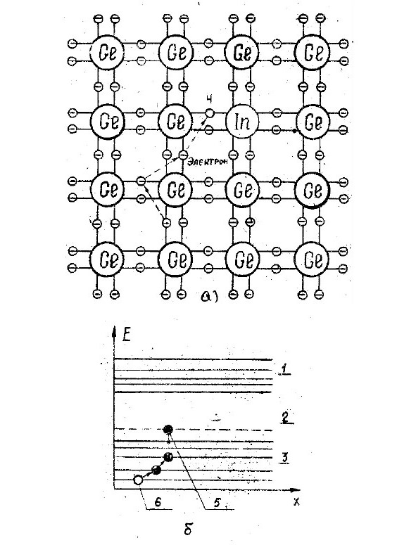 2.5 -rasm. Indiy aralashgan germaniyning ekvivalent zonasi (a) va energetik zona diagrammasi (b):1 – o’tkazuvchanlik zonasi, 2 – taqiqlangan zona, 4 – aktseptor satxi, 5 —elektron, 6 – teshik.