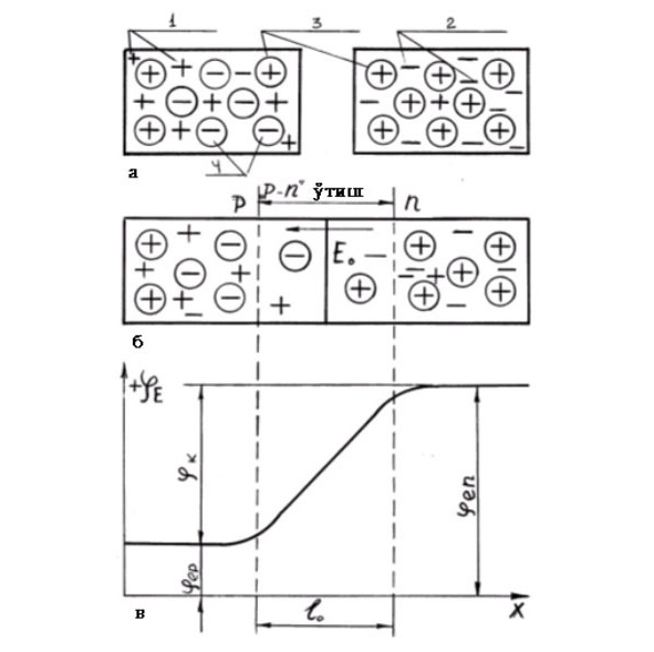 Turli xil o’tkazuvchanlikka ega bo’lgan kristallarni bir – biriga birlashtirilmasa, zaryad tashuvchilar ularning butun xajmi bo’yicha teng taqsimlanadi. Agar sun’iy ravishda «n – r» o’tishni eritish, diffuziya yoki o’stirish usuli bilan xosil qilinib, kristallar birlashtirilsa, chegara qatlamida elektron va teshiklarning rekombinasiyasi yuz beradi. «n» -tur yarim o’tkazgichning o’tkazuvchanlik zonasidagi erkin elektron, «r» tur yarim o’tkazgichning valent zonasidagi erkin kovaklar satxlarini egallaydi. Buning natijasida ikki kristall Birlashgan chegaraviy zona yaqinida zaryad eltuvchilar yo’qoladi va yuqori elektr qarshiligiga ega bo’lgan qatlam xosil bo’ladi. Bu siyraklashgan berkituvchi qatlam yokisi «n -r» o’tish deb aytiladi. Uning qalinligi bir necha mikrondan ortmaydi. Berkituvchi qatlamning kengayishiga xarakatsiz donor va aktseptor ionlari qarshilik ko’rsatadi. Ular kristallar chegarasida kontakt potentsiallar farqini – potentsial to’siqni vujudga keltiradi. Xosil bo’lgan elektr maydon (eo) kuch chiziqlarini yo’nalishi «n» – soxadan «r» soxa tomon bo’ladi va u elektron hamda teshiklarni xarakatlanishiga to’sqinlik qiladi, ya’ni qarshilik ko’rsatadi. Bu maydon ta’sirida «n-r» o’tishning qarshiligi ortadi. (2.6-v-rasmda) «n – r» o’tishli yarim o’tkazgich qatlamlariga mos keluvchi elektrostatik potentsial (e) ning taqsimlanishi ko’rsatilgan. Agar ana shunday yarim o’tkazgichga tashqi manba (GB) dan «r» – tur kristallga «musbat» va r-tur kristallga «manfiy» kuchlanish berilsa (2.7 a-rasm) berkituvchi qatlam yanada kengayadi, chunki kontakt zonalardan xam musbat («r» – zona ichiga), xam manfiy («n» – zona ichiga) tashuvchilarning (elektron va teshiklar) «so’rilishi» yuz beradi. Demak, tashqi manba qutblari 2.7 a – rasmda ko’rsatilgandek bo’lsa, «n – r» o’tishning qarshiligi ortib ketadi va undan oqib o’tayotgan tok miqdori oz bo’ladi. Manbaning bunday ulanishi teskari ulash deyiladi.