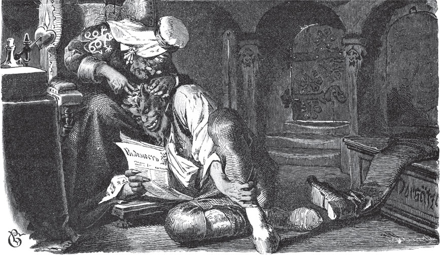 С наступлением вечера и черт вернулся домой. Едва вступил он в преисподнюю, как уж почуял, что воздух в ней не тот. «Чую, чую я здесь человечье мясо, – сказал он. – Тут что-нибудь не так!» И пошел он заглядывать по всем уголкам и закоулкам и нигде ничего не нашел. А его мать давай его бранить: «Только что выметено и все в порядок приведено, а ты мне опять все взбудоражишь! Нанюхался там человечьего мяса, так оно тебе везде и чудится! Садись и ешь свой ужин». Когда он наелся и напился, то почувствовал утомление, положил матери голову на колени и попросил, чтобы она у него в голове поискала. Немного прошло времени, а уж он и засопел, и захрапел. Тогда старуха выискала у него в голове золотой волосок, вырвала его и положила в сторонке. «Ай-ай! – крикнул черт. – Что это с тобой?» – «Да вот приснился мне такой нехороший сон, – отвечала ему мать, – что я тебя и ухватила за волосы». – «Что же такое тебе приснилось?» – спросил черт. – «Приснилось мне, что фонтан на базарной площади, из которого некогда струей било вино, вдруг так иссяк, что теперь из него и воды не добыть… Что бы этому за причина?» – «Эх, кабы они только знали! – отвечал черт. – В том фонтане сидит под одним из камней жаба; и если они ту жабу убьют, так вино-то опять из него струей бить станет». Стала опять у него мать в голове перебирать и перебирала, пока он совсем не заснул и не захрапел так, что окна дрожали. Тогда вырвала она у него второй волосок. «У-у! Что это ты делаешь?» – гневно крикнул черт. «Не посетуй на меня! – отозвалась мать. – Ведь это я во сне!» – «Да что тебе там опять приснилось?» – «А вот приснилось, что в некотором царстве стоит дерево, и на том дереве прежде, бывало, золотые яблоки росли, а теперь и листьев нет. Что бы этому могло быть причиной?» – «Э-э, кабы они знали да ведали! – отвечал черт. – У того дерева корень гложет мышь; стоит только ту мышь убить, и на дереве опять будут расти золотые яблоки; а если ей еще дадут глодать тот корень, так дерево и совсем засохнет. Но только ты, пожалуйста, не тревожь меня больше своими снами, а если потревожишь – я с тобою по-свойски расправлюсь!» Матери удалось его опять успокоить, и она снова стала перебирать у него в волосах, пока он не заснул и не стал храпеть. Тогда она ухватила и третий золотой волосок и вырвала его. Черт вскочил, закричал во всю глотку и хотел с нею круто обойтись, но она еще раз его умаслила и сказала: «Что ты станешь с этими дурными-то снами делать!» – «Да что же тебе могло сниться?» – спросил он, любопытствуя узнать ее сон. – «Да вот, снился мне перевозчик, который все жалуется на то, что ему век свой приходится взад да вперед по реке ездить, и никак он от этого освободиться не может. Что бы тому за причина?» – «Э-эх, дурень-дурень! – отвечал черт. – Да ведь стоит ему только передать шест в руки первому, кто в его лодке переезжать вздумает, тогда он и освободится; а тот должен будет стать на его место перевозчиком». Так как мать вырвала у него из головы все три золотых волоска и на все три вопроса получила ответы, то она оставила старого черта в покое и дала ему выспаться до самого рассвета. Когда черт опять убрался из дома, старуха добыла мураша из складки своего платья и вновь возвратила счастливчику его человеческий образ: «Вот тебе три золотых волоска, – сказала она, – да и ответы черта на твои три вопроса ты, вероятно, тоже сл