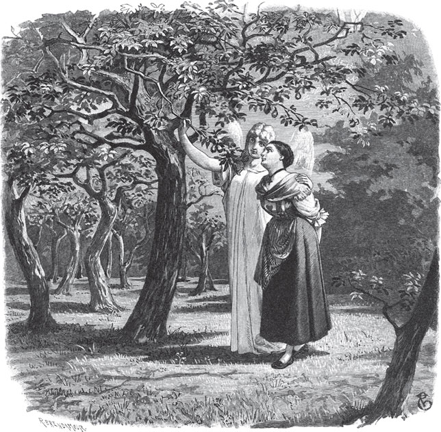 Чуть стемнело, пришел король в сад и привел с собою священника, который должен был вступить с духом в беседу. Все трое уселись под деревом и стали прислушиваться. В самую полночь выползла безручка из куста, подошла к дереву и опять, прямо с ветки, не срывая, съела еще одну грушу; а рядом с нею стоял ангел в белоснежном одеянии. Тогда выступил священник из-под дерева и спросил: «От Бога ты ниспослан или из мира пришел? Дух ли ты или человек?» Она отвечала: «Я не дух, я – несчастная, всеми покинутая, кроме Бога». Король сказал: «Если ты всеми покинута, то я тебя не покину». Он взял ее с собою, повел в свой королевский замок, полюбил ее за красоту и кротость ее, приказал ей приделать серебряные руки и взял ее себе в супруги.