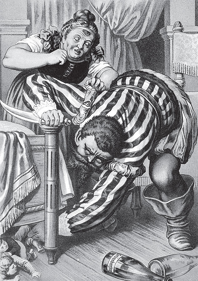 И когда она к старухе пришла, та спросила ее: «Отчего ты это такая бледная?» – «Ах, – отвечала девушка (а дрожь так и пробирала ее по телу!), – уж очень я испугалась того, что увидела!» – «А что же ты видела-то?» – «Я видела у вас на крылечке черного человека». – «Это был угольщик». – «А потом увидела зеленого человека». – «Ну это был охотник». – «А затем увидела как кровь красного человека». – «Это был, конечно, мясник». – «Ах, госпожа Тру́да, я в себя не могу прийти от страха, смотрела я потом в окошко и вас-то не видела, а на вашем месте сидел черт, и голова у него была вся в огне». – «Ого, – сказала госпожа Тру́да, – так, значит, ты видела ведьму во всем ее уборе! А я уж давно тебя поджидала: ты теперь мне и посветишь». Тут она оборотила девушку в деревянный чурбан и швырнула ее в огонь. И когда огонь вполне разгорелся, ведьма к нему подсела, стала греться около него и приговаривать: «Вот теперь горит светленько и тепленько!»