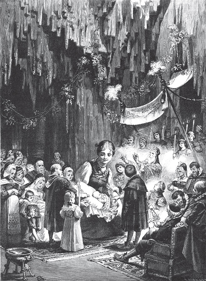 Жила-была однажды бедная служанка, чистоплотная и на службу ретивая; она каждый день убирала дом и вытряхивала сор на большую кучу около дверей. Однажды, когда служанка только что собиралась приняться за работу, она нашла на двери письмо и так как не могла его прочесть, то поставила метлу в уголок и принесла письмо к своим господам; а в том письме оказалось приглашение от домовых духов, которые звали девушку крестить у них ребенка. Девушка была в нерешимости, как ей поступить; но, наконец, после многих уговоров и после того, как господа сказали ей, что от такого приглашения нельзя отказываться, она согласилась. Тогда явились трое домовых и повели девушку внутрь горы, где жили эти маленькие человечки. В их жилье все было маленькое, но такое красивое и миленькое, что и описать невозможно. Родильница лежала на кровати из черного дерева, украшенной жемчужками, одеяльца были золотом расшиты, колыбелька из слоновой кости, а ванночка из чистого золота. Покончив с крестинами, девушка хотела было вернуться домой, но маленькие домовые убедительно стали уговаривать ее, чтобы она у них прогостила три дня. Она исполнила их желание и провела время в веселье и радости, и маленькие домовые старались ей во всем угодить. Наконец она собралась домой, и тогда ее маленькие хозяева набили ей полнешеньки карманы золота и вывели ее из горы. Вернувшись домой, девушка задумала приняться за свою обычную работу, взяла было в руки метлу, которая, как и прежде, стояла в том же углу, и начала подметать. Но из дома вышли какие-то незнакомые люди и спросили у девушки, кто она и что она здесь делает? Оказалось, что она пробыла в горе у маленьких домовых не три дня, а семь лет, и ее прежние господа тем временем успели умереть.