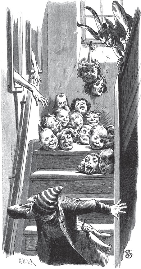 Вот и вздумалось бедняку однажды посетить своего кума и рассказать ему, как успешно он лечит его водицей. Когда же он пришел к куму в дом, то все показалось ему чрезвычайно странным. На первой площадке лестницы он увидел, что метла с лопатой ссорятся и дерутся. Он спросил у них: «Где тут живет господин кум мой?» Метла отвечала: «Лестницей выше!» Взойдя на вторую площадку, он на ней увидел множество отрубленных пальцев. Он спросил у них: «Не здесь ли живет господин кум мой?» – «Лестницей выше!» – отвечал ему один из пальцев. На третьей площадке он увидел кучу мертвых голов, которые опять-таки указывали ему, что следует взойти еще на одну лестницу. На четвертой площадке он увидел на огне сковороду с рыбами, которые сами себя поджаривали. Они также сказали ему: «Лестницей выше!» И вот когда он поднялся на пятую площадку, то очутился перед дверью комнаты; заглянул в скважину двери и увидел своего кума, а у кума на голове рога большие-пребольшие. Отворил он дверь, вошел, а кум поскорее улегся в постель да и прикрылся с головой. Тогда сказал он куму: «Ну, куманек! Тут у вас в доме все что-то очень мудрено! Взошел я на первую площадку и вижу – ссорятся на ней лопата с метлой, да так и наскакивают друг на друга!» – «Какой же ты недальновидный! – сказал ему кум. – Да ведь это слуга со служанкой между собою калякали…» – «Ну а вот на другой-то площадке увидел я отрубленные пальцы». – «Э-э, какой же ты глупый! Да ведь это были вовсе не пальцы, а корни козелка!» – «А вот еще на третьей-то площадке лежала целая куча голов?» – «Экий дурень! Да это же не головы, а кочаны капусты!» – «Ну вот еще и на четвертой – рыбы лежали на сковороде и сами себя поджаривали». Чуть только он это сказал, рыбы сами явились в комнату и поднесли себя куму. «Да вот еще, куманек, как поднялся я на пятую площадку, так глянул сквозь скважину двери и увидел вас – и на голове у вас рога большие-пребольшие?..» – «Ну это уж неправда!» – сказал кум, и бедняку вдруг стало так страшно, что он от кума бегом пустился с лестницы – и кабы не убежал, так еще Бог знает, что бы ему от кума досталось.