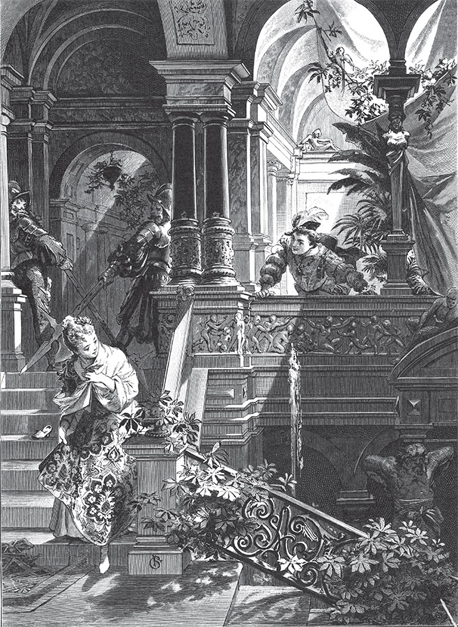 Встряхнись, встрепенись ты, мое деревце,Просыпь на меня злато-серебрецо.И птичка сбросила ей платье еще богаче, еще наряднее вчерашнего. И когда она в этом наряде явилась на празднество, все надивиться не могли ее красоте. А королевич уже поджидал ее, взял ее тотчас за руку и танцевал только с ней одной. Когда другие мужчины подходили к ней, чтобы пригласить ее на танец, королевич говорил: «Я с ней танцую». По наступлении вечера Замарашка задумала удалиться, а королевич пошел за ней следом и хотел посмотреть, в какой дом она войдет; но та юркнула в сторону и убежала в сад позади дома. В том саду росло прекрасное большое грушевое дерево, и на нем много было чудных груш. На него-то и взобралась Замарашка, словно белочка, и укрылась в ветвях его, а королевич даже и не знал, куда она подевалась. Подождал он немного, пока подошел отец Замарашки, и сказал ему: «Вот тут одна красотка от меня ускользнула, и мне сдается, что она залезла на эту грушу». Отец подумал: «Уж не Замарашка ли это?» – потребовал топор и срубил дерево; но на дереве никого не оказалось. И когда они все вернулись домой, увидели Замарашку, как и всегда, на куче золы… Она проворна была: с одной стороны на дерево влезла, с другой стороны спрыгнула, вернула свой наряд птичке, что сидела на орешине, и опять напялила свои серые лохмотья.