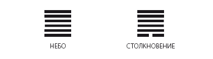 «Иногда в текстах к некоторым уровням знаков Книги Перемен дается образ, но не дается гадательных слов. А иногда – наоборот: есть гадание, но нет образа. В таких случаях следует понимать, что гадательная часть находится внутри образа, а образ находится внутри гадательной части. Так, в знаке НЕБО на Начальном, втором, четвертом, пятом и Верхнем уровнях разделяются образы и гадания. Что касается Девятки третьей, то слова „До конца дня Напряжен-Напряжен, вечером встревожен“ являются гадательным текстом, а образы находятся внутри них».