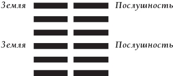 При удвоении трехуровнего знака Земля получается знак ЗЕМЛЯ, Послушность, состоящий из шести уровней. Так в знаках выражается чистый инь, предельная Послушность. Этому имени и этому образу свойственно отсутствие изменяемости. Самка коня – это Послушность, способная быть неизменной в своем движении. Ян начинает, инь следует, ян управляет смыслом, совестью, инь управляет ценностями. Юго запад – иньская сторона, северо восток – янская сторона[19]. ЗЕМЛЯ – это действие спокойной Послушности.