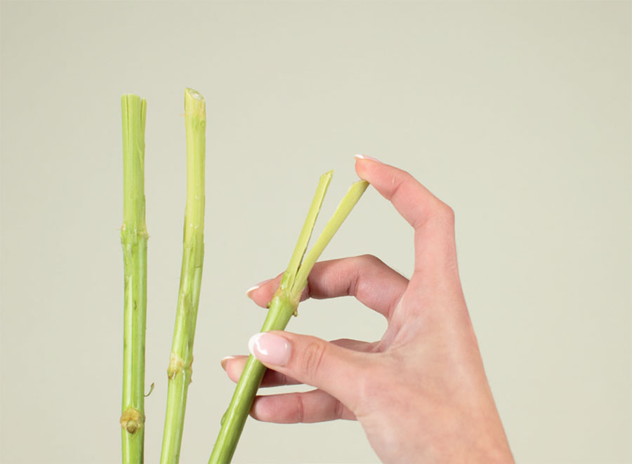 Листву с цветка можно удалить различными способами. Наш любимый – пальцами. Возьмите цветок за верхушку стебля одной рукой, а другой – за стебель, затем аккуратно проведите рукой вниз по стеблю, чтобы снять листву.