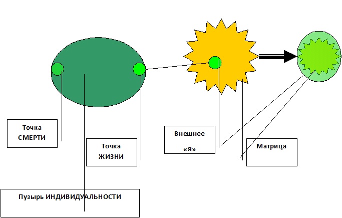 Наше исходное положение – две точки на пузыре индивидуальности. В одной из них мы помещаемся при жизни, в другой – после смерти. Разумеется, эти точки могут принимать разное положение, но они никогда не соприкасаются – между ними всегда есть «барьер ИНДИВИДУАЛЬНОСТИ», которая и является для нас ЗАПРЕТНОЙ ЗОНОЙ. Есть два момента, когда они соединяются воедино – момент ВОПЛОЩЕНИЯ и момент СМЕРТИ, а всё остальное время барьер, разделяющий эти точки, оказывается непреодолимым.