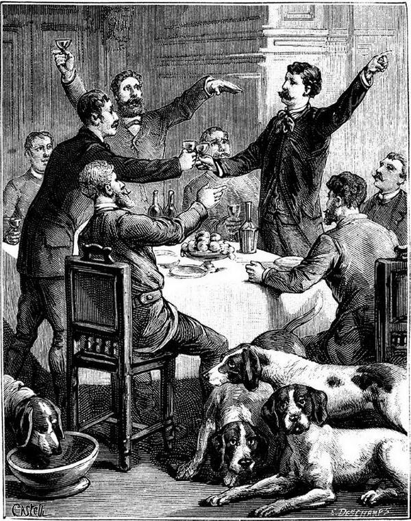 Сам хозяин во время охоты не сделал ни одного выстрела. Чтобы утешить гостей в их совершенно оправданной печали, он прибегнул к неизменному средству – угостил их самыми лучшими винами из своего погреба. Средство великолепно подействовало и послужило прелюдией к многочисленным кушаньям, изумительно приготовленным поварихой Софи, которая на этот раз превзошла самое себя. Благодаря изысканным яствам и чудным винам, настроение гостей существенно переменилось к лучшему. Досада от неудачной охоты улетучилась. Головы разгорячились. Тон разговора из минорного перешел в мажорный.