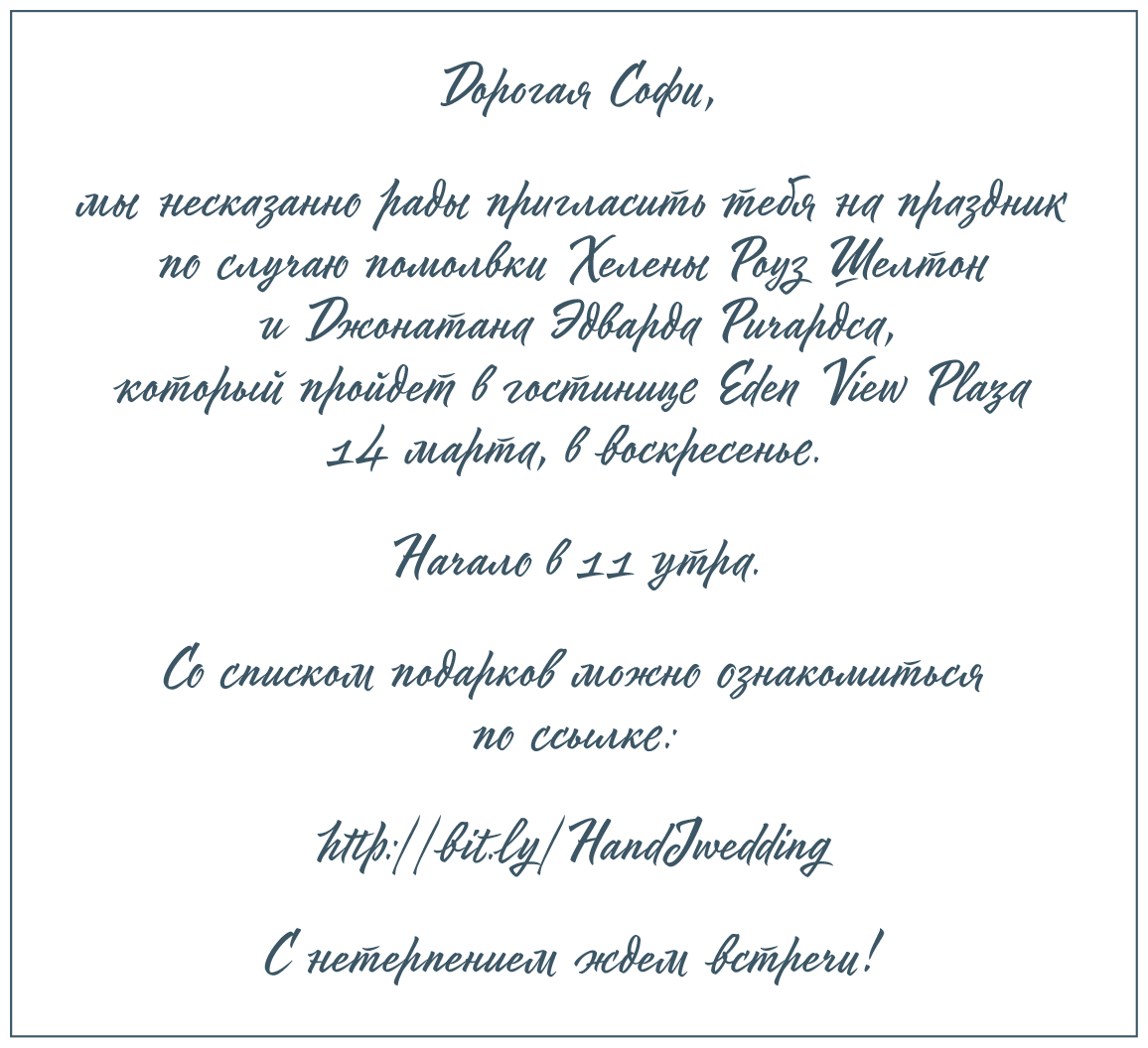 После того как месяц назад Джонни сделал Лене предложение, я уже с ними общалась, так что понятия не имею, что еще сказать. Неужели повторять то, что уже писала им в WhatsApp и в комментариях к постам в соцсетях?