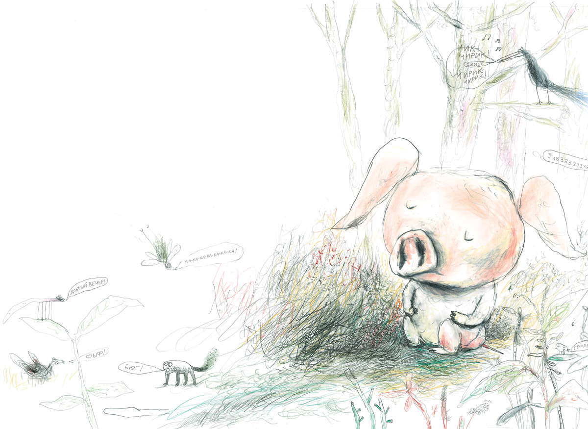 Поросёнок Хвост Морковкой сидел под деревом и слушал шум леса. Шелестела трава, нежно напевала агушка. Поросёнок закрыл глаза и заслушался. И тут посреди бархатистых мечтаний прорезался тонкий резкий писк. «Что это зудит?» – подумал Поросёнок. Звук приближался. «Может, крошечный самолётик? Или мышка гоняет на мопеде?» – гадал Поросёнок.