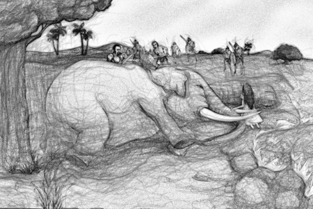 "Сегодня вечером мы пируем!" крикнул дородный мужчина с жирными черными волосами. Он надел шлем на кончик копья и помахал им в воздухе. "На жареной ноге зверя и тушеном слоновьем ухе.”