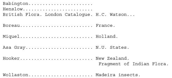 ...I write now to supplicate most earnestly a favour, viz., the loan of "Boreau, Flore du centre de la France", either 1st or 2nd edition, last best; also "Flora Ratisbonensis," by Dr. Furnrohr, in 'Naturhist. Topographie von Regensburg, 1839.' If you can POSSIBLY spare them, will you send them at once to the enclosed address. If you have not them, will you send one line by return of post: as I must try whether Kippist (The late Mr. Kippist was at this time in charge of the Linnean Society's Library.) can anyhow find them, which I fear will be nearly impossible in the Linnean Library, in which I know they are.
