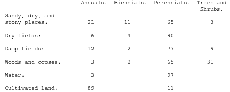 I must allude to one of your last notes with very curious case of proportion of annuals in New Zealand. (376/5. On this subject see Hildebrand's interesting paper "Die Lebensdauer der Pflanzen" (Engler's "Botanische Jahrbucher," Volume II., 1882, page 51). He shows that annuals are rare in very dry desert-lands, in northern and alpine regions. The following table gives the percentages of annuals, etc., in various situations in Freiburg (Baden): —
