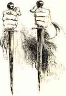С кинжалом в руках он тихо прокрался в темную комнату, где спал Дункан. Макбет уже замахнулся на короля, но вдруг увидел, как в воздухе сверкнул другой кинжал с окровавленным клинком, направленный на Макбета… Когда же он хотел схватить появившийся кинжал, то оказалось, что ничего не было, – это только померещилось напряженному и расстроенному воображению Макбета.