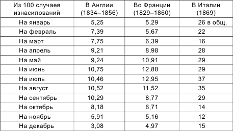 Оказывается, что среди преступлений против личности детоубийство занимает первое место в январе, феврале, марте и апреле (647, 750, 783, 662); это соответствует, с одной стороны, большему числу рождений, которые имеют место весной, уменьшаясь в мае, и особенно в июне и в июле, и опять увеличиваясь в ноябре и декабре (время карнавала); а с другой – увеличению числа незаконных рождений (1100, 1131, 1095, 1134) и выкидышей.