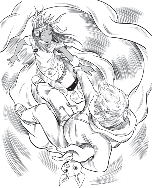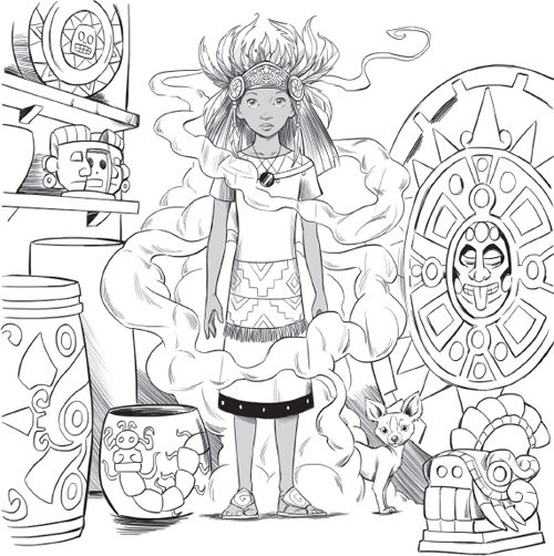 Zuma shook her head. “He’s Tlaloc, the rain god,” she whispered. “I was supposed to be sacrificed to him, but I escaped.” She rolled her eyes. “I can’t believe he’s still angry about that.”