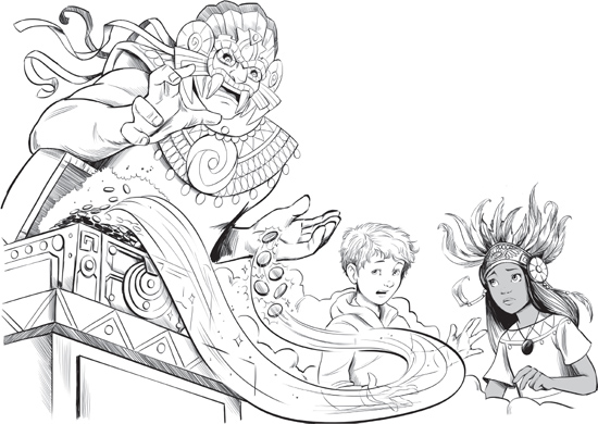 The rain god pointed one huge finger at the treasure chest. The lid lifted with a loud creak. Even though he was scared, Tom was impressed by the god’s magic. The chest was filled with gold coins, each bearing the image of an Aztec sun. Tlaloc waved his hand and six shiny coins rose out of the chest and sailed across the room. They landed with a jangle in his palm.