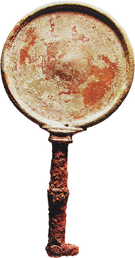 Медное зеркало с железной ручкой, найденное при раскопках в Цюйгуне