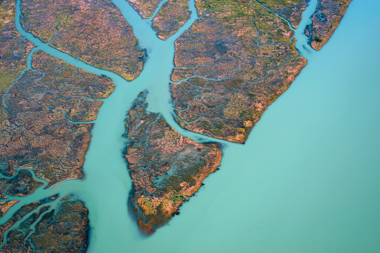 NOUN a triangular piece of land at the mouth of a river where it divides into separate streams