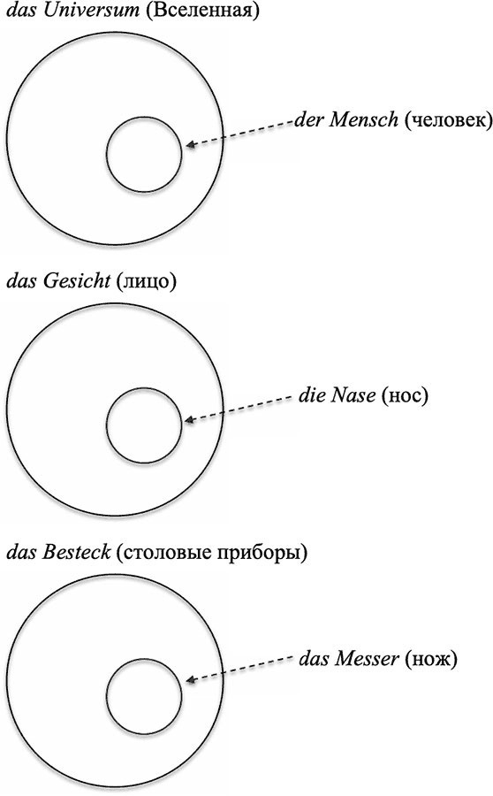 Как видно на рис. 1, существительные среднего рода часто представляют собой наибольший круг в своей категории. Однако такие обобщающие понятия могут включать компоненты любого грамматического рода, в том числе и среднего.