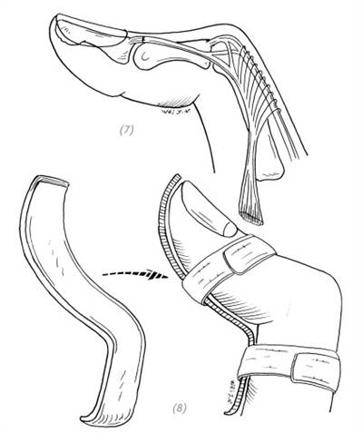 (7), (8) после восстановления сухожилия разгибателя используют алюминиевую шину для фиксации проксимального межфалангового сустава в положении сгибания и дистального межфалангового сустава в положении разгибания