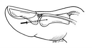 Рис. 7–13. Операция по сшиванию раны резаного типа на «конечной точке» сухожилия разгибателя