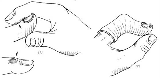 (1) хирург пальцами надавливает на гипсовую лангету, что может вызвать некроз кожи на тыльной стороне; (2) правильный метод – заставить пациента большим пальцем надавливать на повреждённый палец в гипсовой лангете в виде трубки, чтобы дистальная фаланга была разогнута
