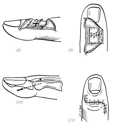 (8), (9) сшивание сухожилия разгибателя; (10) фиксация спицами Киршнера дистального сустава в положении разгибания на 6 недель; (11) зашивание разреза