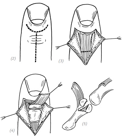 (2) разрез; (3) – (5) на тыльной стороне пальца делают разрез с формированием кожных лоскутов и раскрывают лоскуты в разные стороны, сухожилие на проксимальном конце конечной точки сухожилия разгибателя отрезают и поднимают, чтобы выявить место отрывного перелома