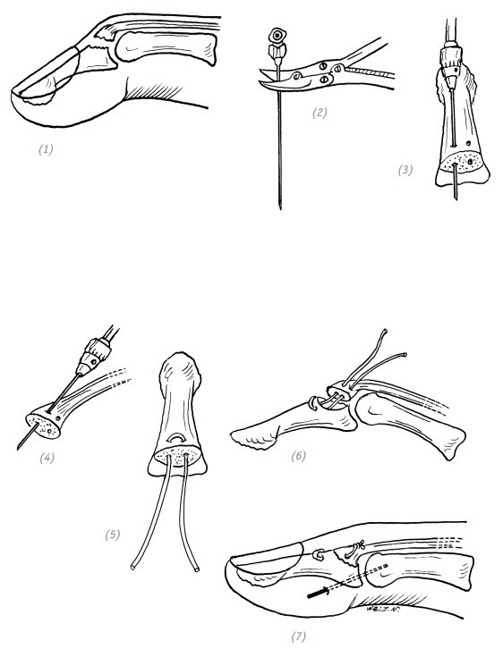 (1) отрывной перелом точки фиксации сухожилия разгибателя; (2), (3) использование иглы для шприца вместо спиц Киршнера для просверливания двух отверстий на тыльной стороне в месте перелома на дистальной фаланге; (4) выполнение соответствующих двух маленьких отверстий, проходящих через поверхность перелома на отломке; (5) – (7) использование стальной проволоки для закрепления, а также применение спиц Киршнера для фиксации сустава пальца на 6–8 недель