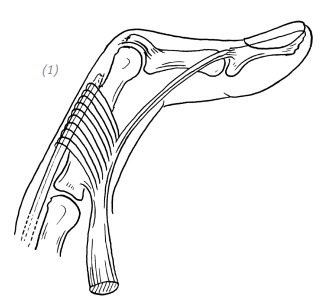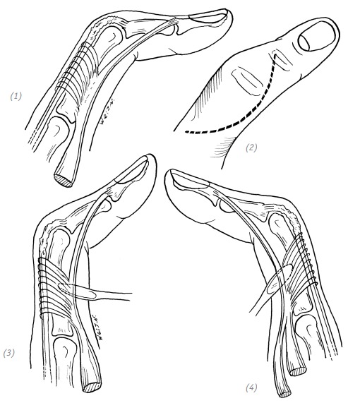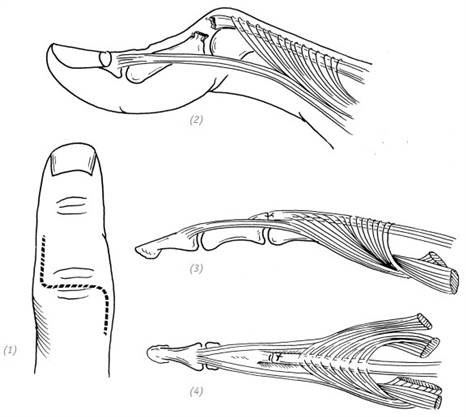 (1) травма центрального пучка сухожилия разгибателя; возникла петельная деформация, также рубцовое соединение двух концов разорванного центрального пучка сухожилия в удлинении, тонуса нет; (2) доступ: делается большой дугообразный разрез на тыльной стороне проксимальной и средней фаланги пальца; (3), (4) разъединение «тупым» способом, ослабление апоневроза разгибателя и латеральных пучков сухожилия разгибателя с обеих сторон