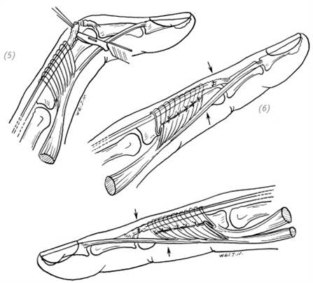 Рис. 7–22. Отсроченное восстановление центрального пучка сухожилия разгибателя пальца после травмы (рис. (1))