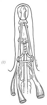 (1), (2) если центральный пучок сухожилия повреждён, а его конечная точка фиксации сухожилия сохранена, проксимальный конец имеет дефект и не может быть сшит «конец в конец», то можно после полного ослабления апоневроза разгибателя и обоих латеральных пучков натянуть латеральные пучки на тыльную сторону пальца и сделать пересадку, используя сухожилие длинной ладонной мышцы или другие свободные сухожилия. Восстановление анатомических связей центрального пучка сухожилия с его латеральными пучками способом, показанным на рисунке (2)