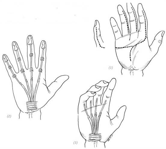 (1) разрез; (2) метод свободной трансплантации сухожилия нескольких пальцев такой же, как и метод, описанный выше; (3) при операции натяжение шва пересаженного сухожилия должно быть в положении покоя для каждого пальца (прим. редактора: среднее физиологическое положение)