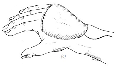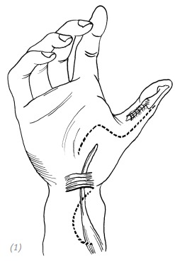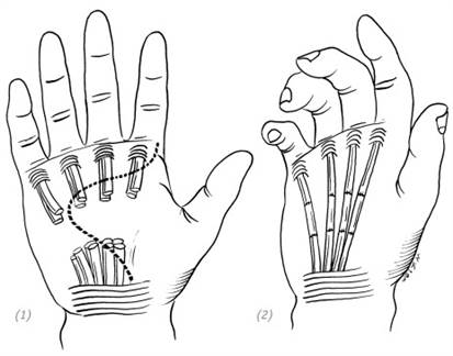 1. Делается срединный разрез на лучевой стороне большого пальца и продляется он до проксимального конца через пястно-фаланговый сустав и тенар, а затем делается дугообразный доступ от проксимального конца поперечных складок запястья.